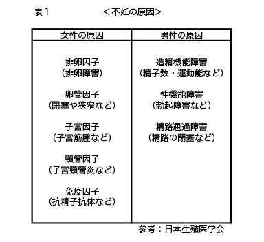 女性および男性それぞれで認められる西洋医学的な原因には表1で示すような形態的な原因、機能的な原因などが挙げられます。また、直接的な原因とはなりませんが、ストレスや冷え症、自律神経の乱れなども不妊に影響しているのではないかといわれています。