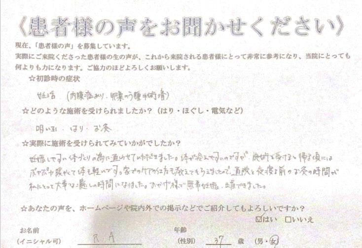 妊娠しやすい体づくりの為に通わせていただきました。身体が冷えやすいのですが、施術を受けると帰る頃にはポカポカ暖かく体も軽いです。家でのケアの仕方も教えてもらえましたので、通院と夜寝る前のお灸の時間が私にとって大事な癒しの時間になりました。